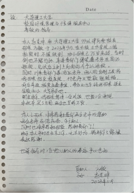 2023年9月,大连理工大学99级建筑系校友赵克非75岁的母亲方敏在二馆拍照时不慎摔倒。校园管理与修缮中心的巡查员傅晓雷发现后立即上前询问并展开施救,同时,找来同事姜鸿飞携手将方敏送至校医院,并全程协助处理检查和交费事宜。事后,他们亲自开车将老人送回家中。