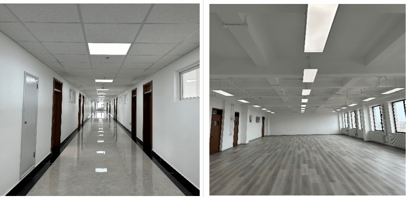 7-8层将原办公用房改造为多功能教室,满足多样化教学需求。走廊地面重新铺贴瓷砖,天棚为A级防火硅酸钙板,提升整体美观实用性,在改造教室中安装护眼灯,加强对学生视力健康的保护。
