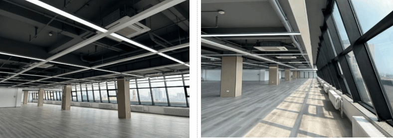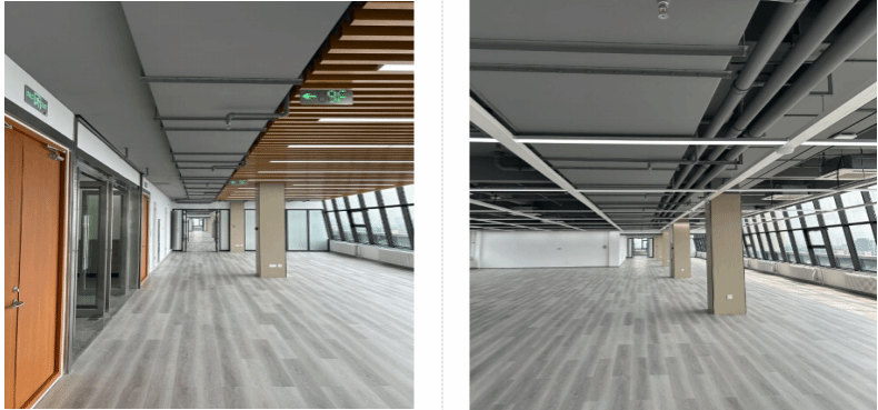 9层的共享科研空间,秉承开放式设计理念,注重增强空间的通透感与互动性。室内融合现代工业风装饰,顶棚以浅灰色喷涂,营造现代而舒适的科研氛围。多联机空调的配备,与开放式的空间格局完美融合,打造安静优雅的学习环境。项目坚持低碳环保理念,地面铺设环保地胶,充分利用玻璃幕墙引入自然光线,并辅助LED灯具照明,充分诠释绿色、节能、健康的修缮风格。