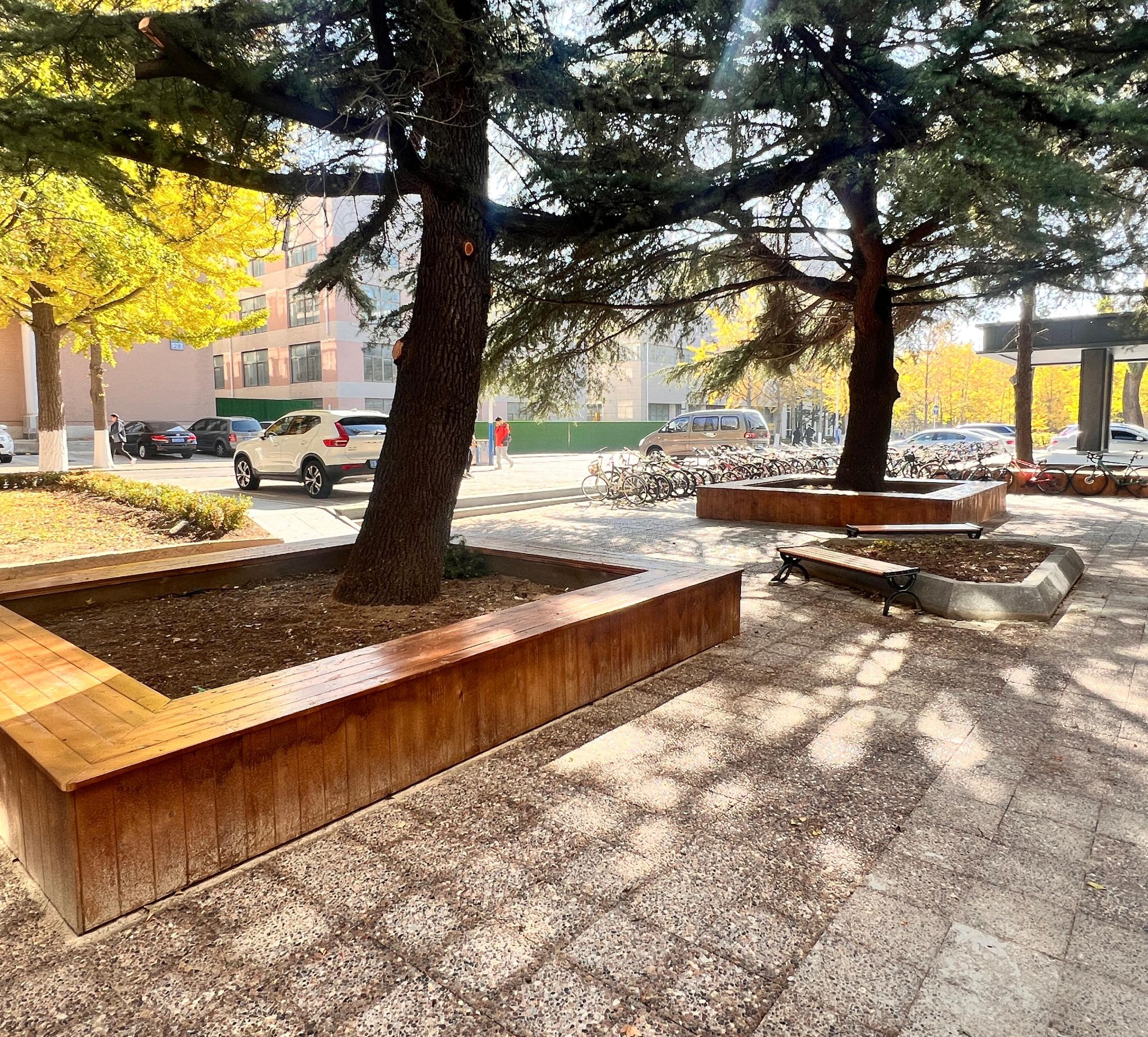 改造过程中,充分考虑师生实际需求,在四楼增设卫生间和公共交流空间,极大地改善了力学楼的学习科研条件。同时,对周边环境进行美化改造,增设了树凳及自行车停放区,为师生提供了更加宜人的休憩空间,既提升了场地的美观度,又提高了使用效率。
