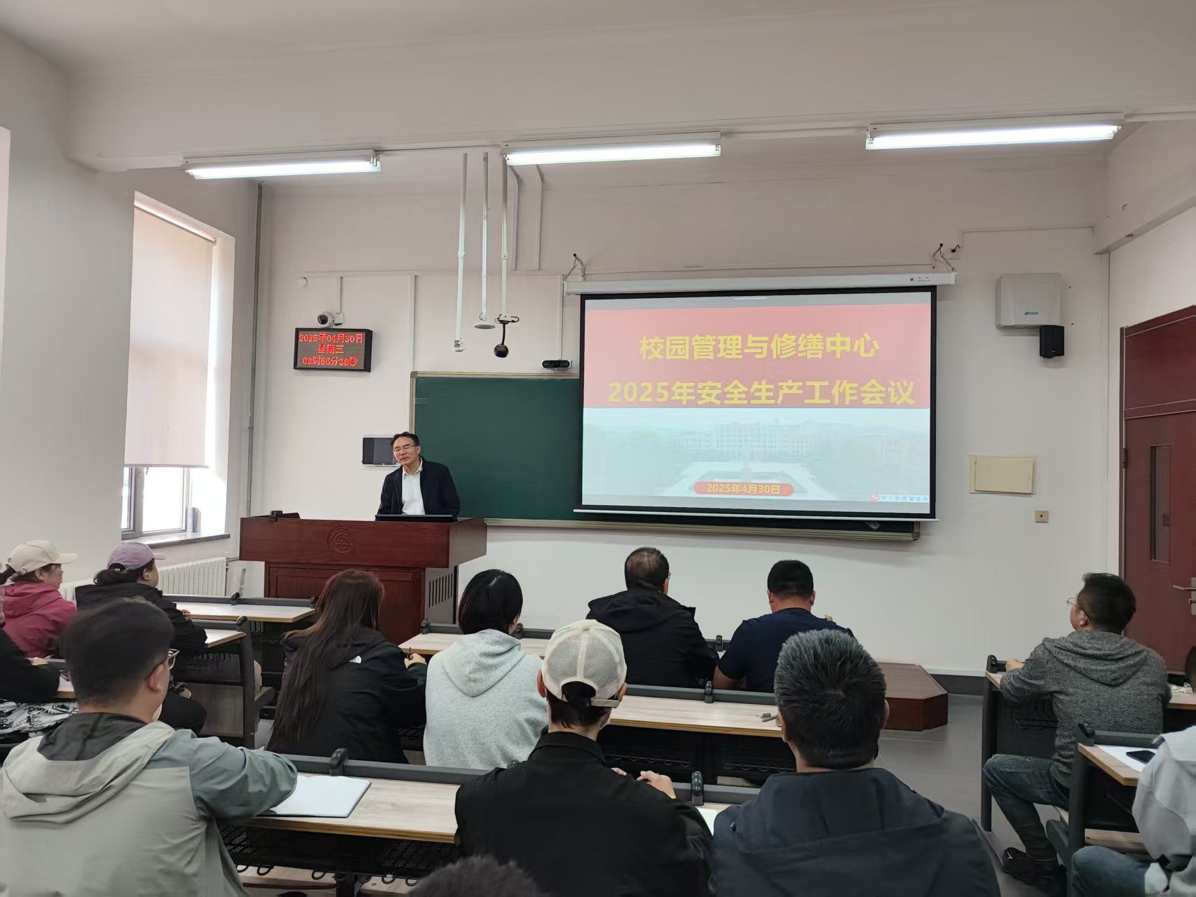 4月30日上午9时,修缮中心在第一教学馆106教室召开2025年度安全生产工作会,全面部署校园施工安全提质行动。承接学校各类修缮任务的施工企业负责人、项目经理、安全员及修缮中心各专业工程师等50余人参会,会议聚焦落实全省教育系统安全稳定工作会议和学校党委工作部署,以“零事故”为目标强化责任链条。任慧韬副主任围绕“安全生产,重于泰山”作专题部署,从校园施工要求、文明施工要求、安全施工要求等维度明确具体要求,并现场宣读《修缮中心违反安全管理规定处理办法(试行)》。