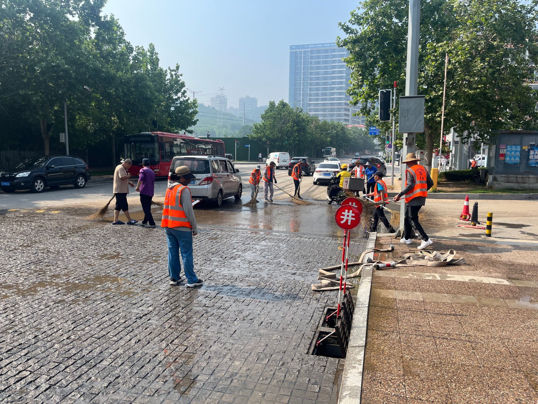 在此次强降雨应对过程中,修缮中心工作人员迅速行动,协同作战,采取一系列有效措施成功化解多处突发情况。在修齐路积水严重路段,抢险人员冒着暴雨紧急封路并实施强排作业,同时协调高新园区调派专业强排车支援,经过连续奋战最终排除水井外溢等问题,在完成路面冲洗后恢复道路通行;针对起重实验室前被暴雨冲毁的路面,抢险队伍立即实施封堵措施,确保道路安全;组织调集100余名人员迅速清理东门、新北门、五食堂北广场等区域积水,清理校内各处风雨吹断的树枝,支撑扶正倒伏树木,及时冲刷清除校友交流中心、经管学院、老专招、东门岗以及校园主干道等区域的泥沙杂物等,第一时间恢复校园环境秩序,确保师生出行安全;校园东侧绘春街交界处围栏被雨水冲毁后,应急队伍第一时间设置临时封闭设施,天气转晴后进行彻底修复,保证边界安全。