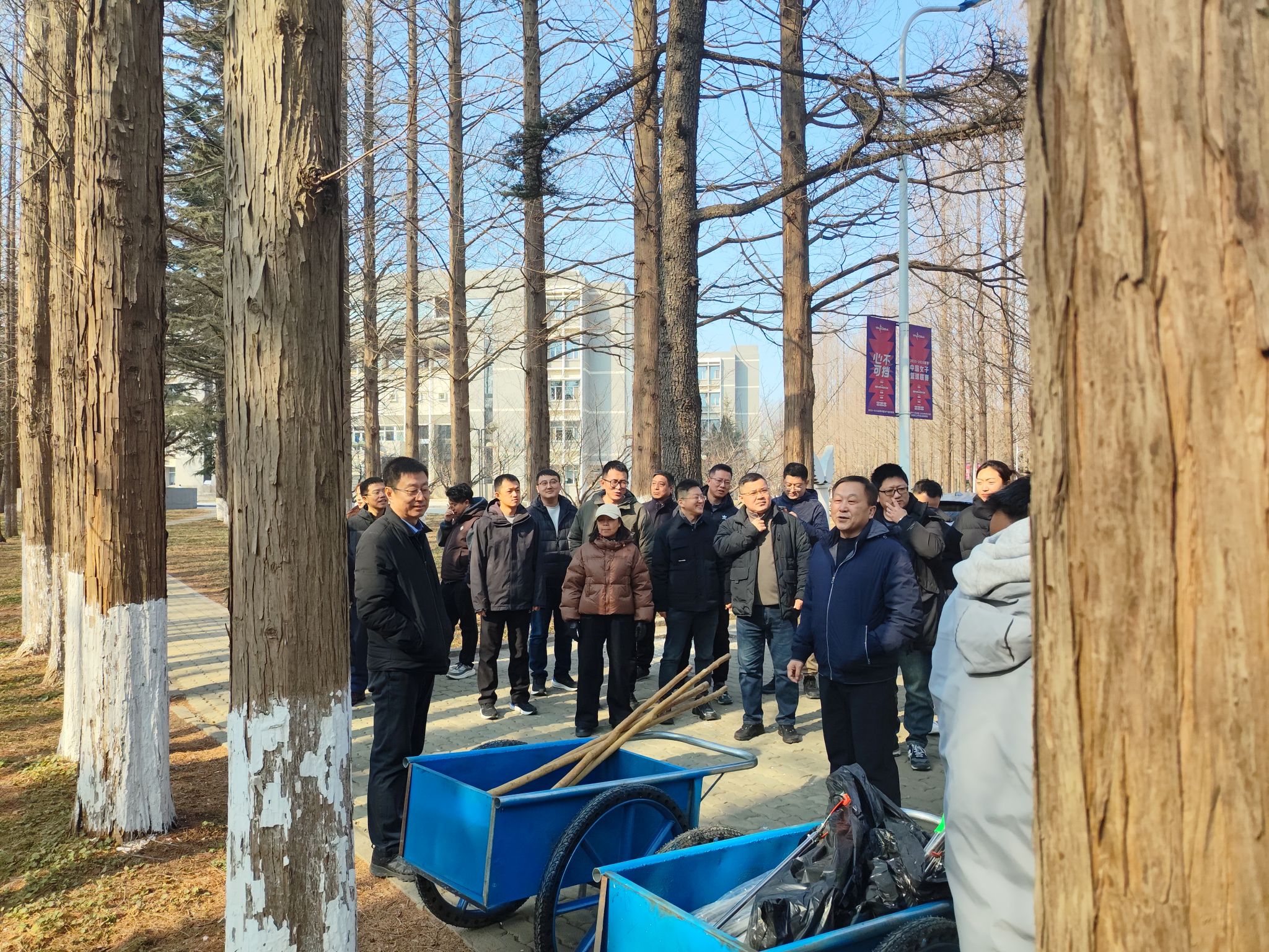 下午2时,主题党日活动启动。主校区全体人员及开发区校区全体人员同步步行至两个校区水杉林区域,通过徒步巡校园、实地清环境,以实际行动守护校园环境,进一步增强责任意识、服务意识和团队凝聚力。