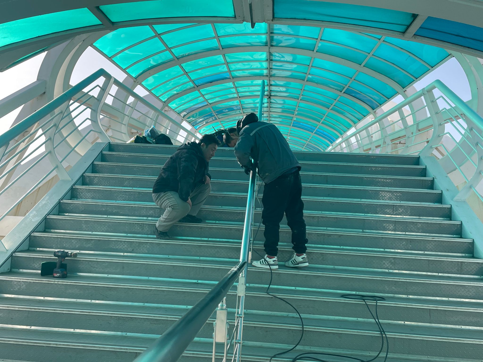 此前,在师生座谈会上,有师生反映学苑桥梯段台阶坡度较陡,雨雪天气路面湿滑,存在通行安全隐患。修缮中心第一时间组织人员现场勘查,结合咨询专业人士、参考建筑标准规范的结果,确定在梯段中间加设扶手的方案。为兼顾工程质量与视觉美观,修缮中心选用兼具耐候性与现代感的白钢拉丝材质打造扶手,此次加装的扶手全长 24 米,全面覆盖桥两侧台阶,还贴心加装防静电、防滑可拆卸护套,方便师生在寒冷天气舒适握持,切实保障师生通行安全。